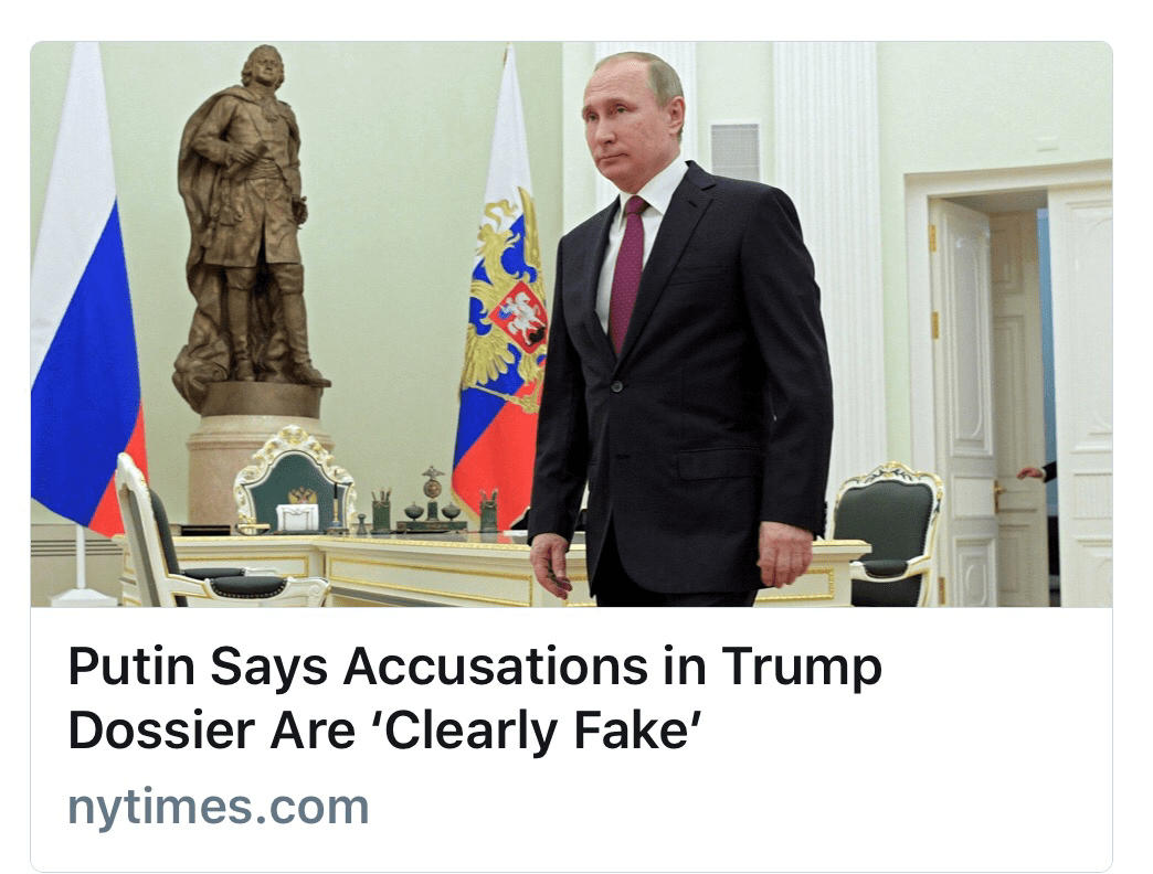 Vladimir Putin says claims that Russia secretly monitored Trump are “rubbish”, and leaked memos alleging Trump and Putin conspired to win the presidential election are: “utter nonsense”. He called the unsubstantiated report “fake”, and stated this was an attempt by some to undermine the legitimacy of a PutiTrump presidency.