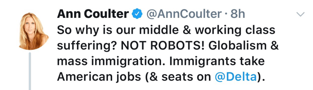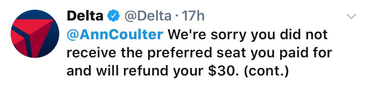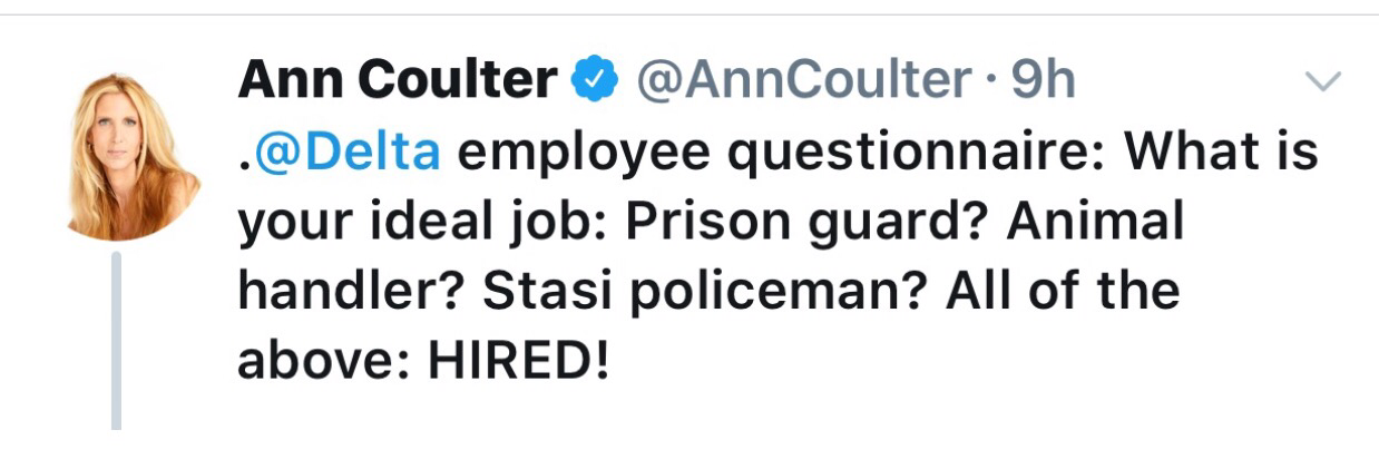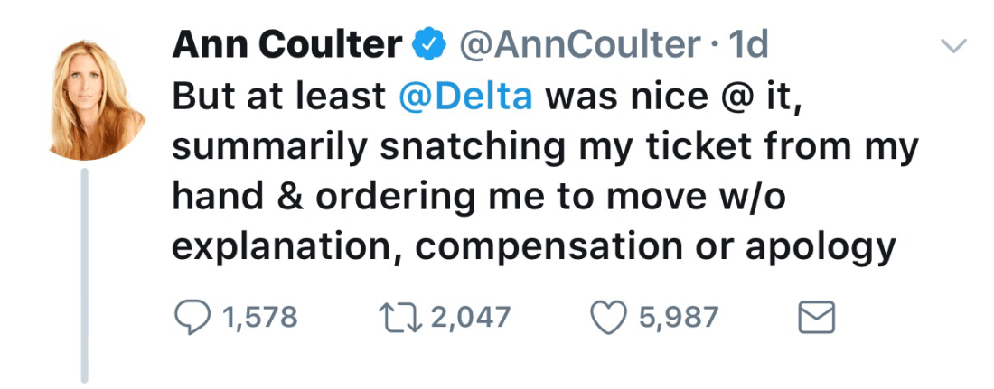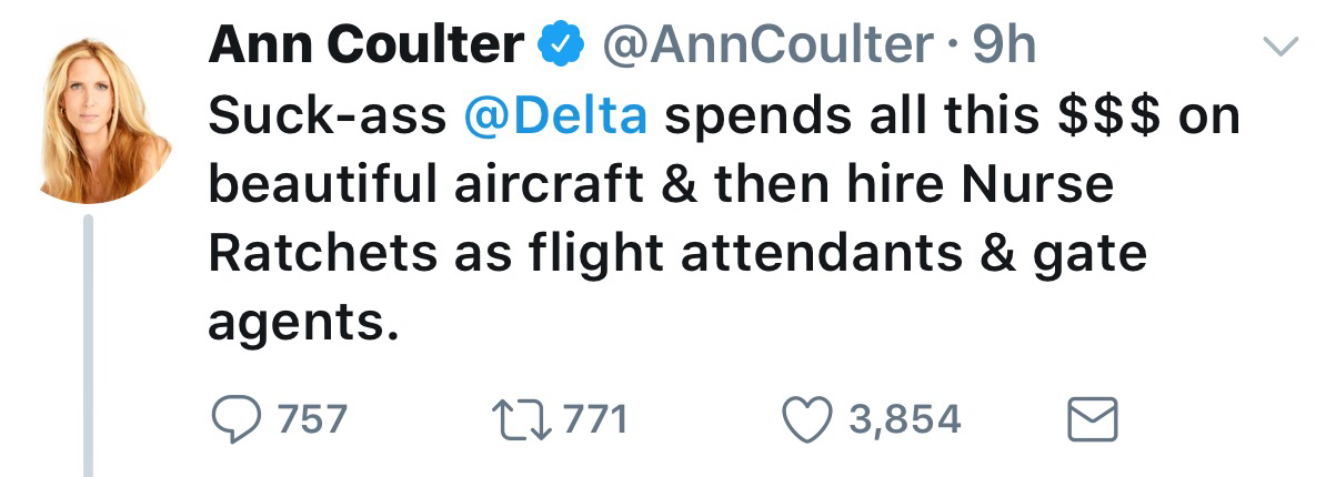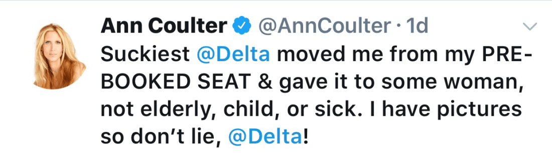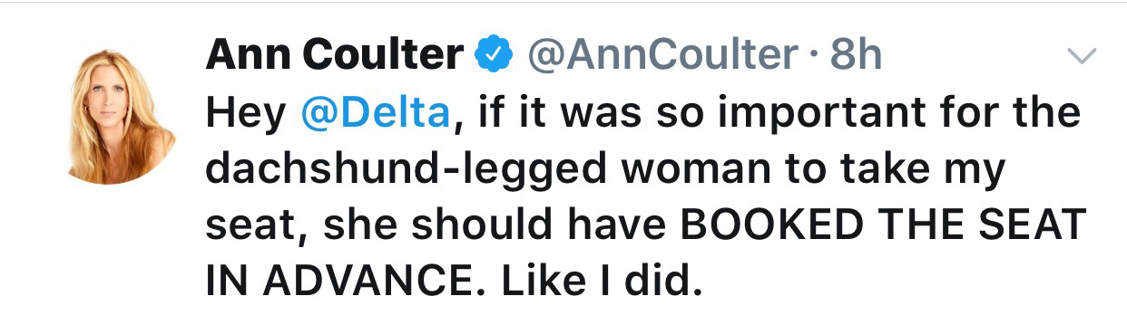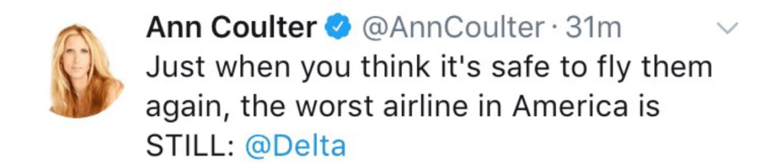 I’d like to pause today to shed light on a travesty of justice inflicted on Ann Coulter…by Delta Airlines.