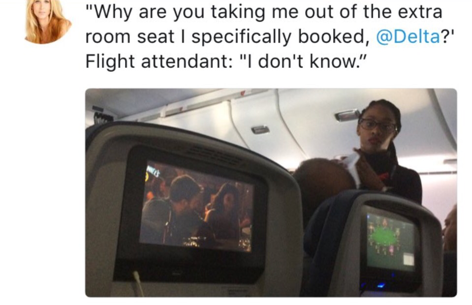 She spent the 2 hour flight tweeting her opinions on the experience. The injustice for someone as white, tall, beautiful and important, (who has no self awareness and believes she is the center of the universe) to be asked to change seats is insufferable. Considering that, in her mind, no one else matters or has feelings, Delta picked the wrong bitch to move.