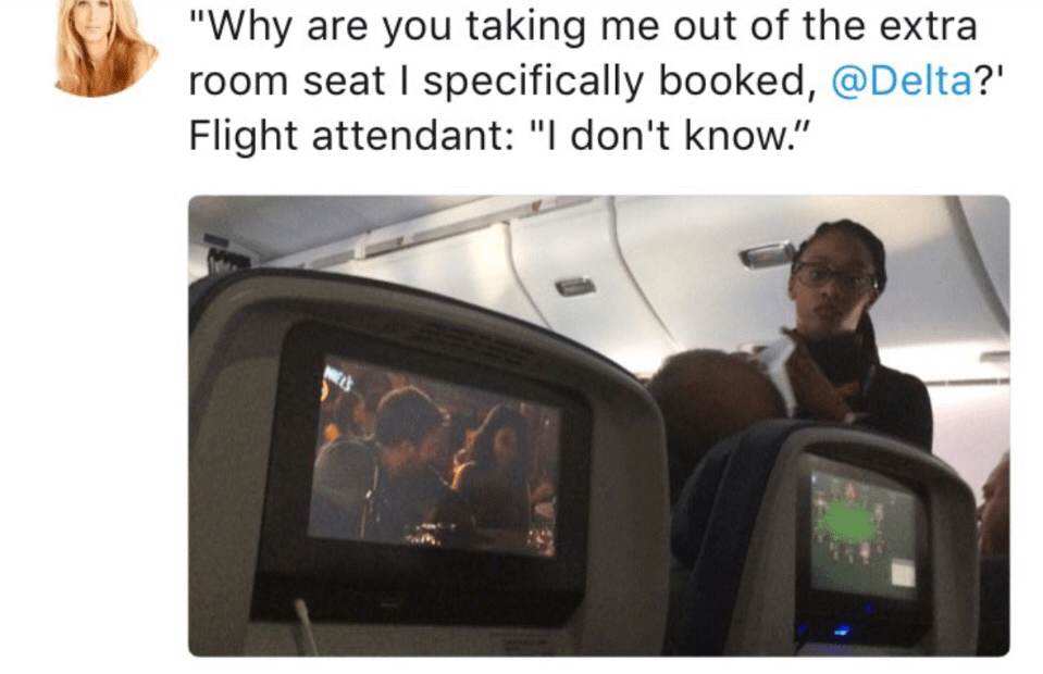 The Airlines changed “her seat.” In her universe, when she went online to purchase her ticket, she clicked on the seat and paid a $30 charge for 3″ of extra legroom, that seat became her seat! She not only owns the seat, she owns the airplane, the employees, and the passengers.