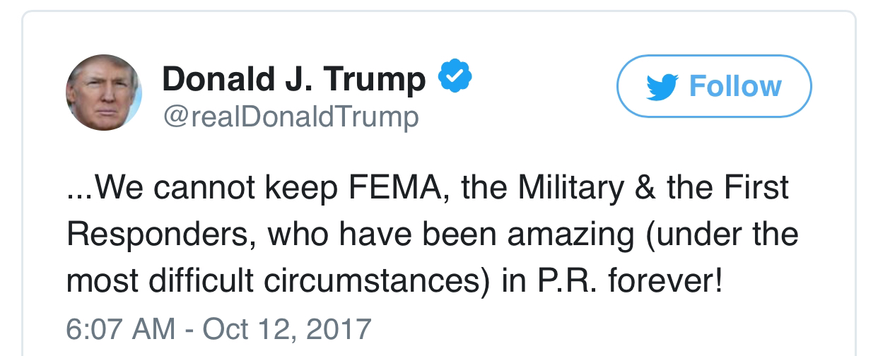 No help coming from Trump, and he’s ready to pull FEMA, because… he and his staff want to use that money to charter jets… for official business. “Can’t keep FEMA in P.R. forever.” Natural disasters are not what tax payer money is for, t’s for golfing, stop being so greedy P.R.