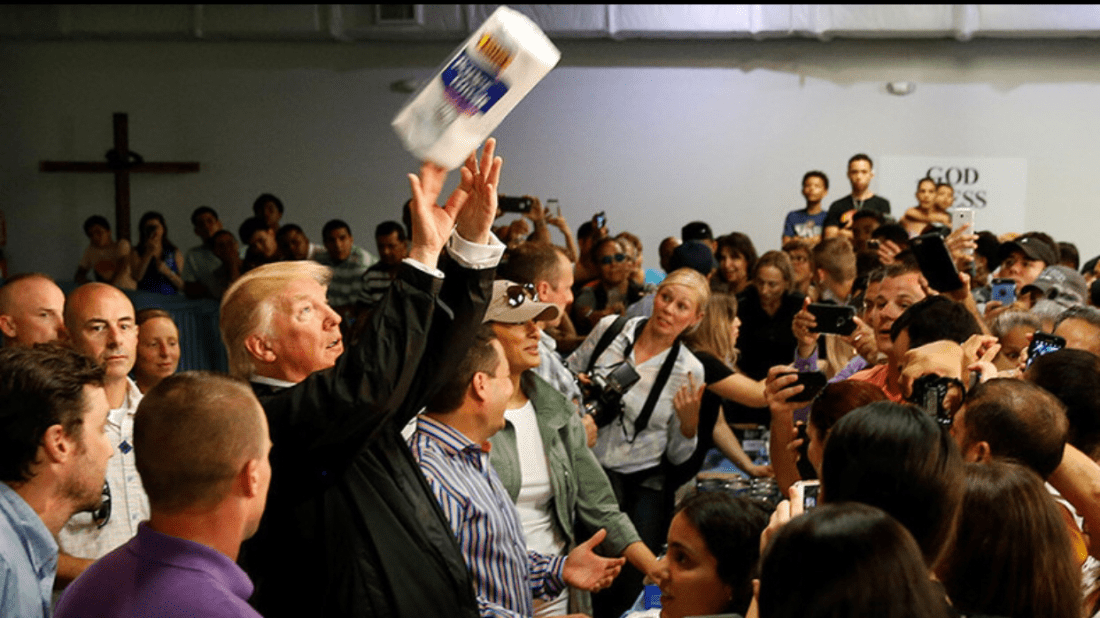 In any event, Trump tossed some high quality paper towels at a crowd, dedicated the golf trophy, from the “Presidential Cup Gold Tournament” in New Jersey, to the people of Puerto Rico. The trophy for bailing and towels soaking up flood waters, really a practical gift.