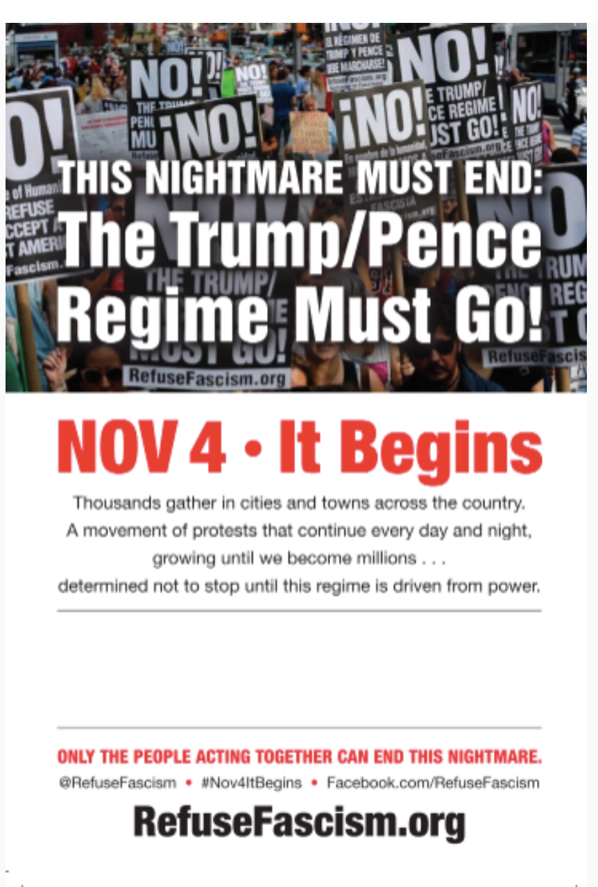 Posters and flyers are popping up across New York, Los Angeles, and other major cities across the country announcing demonstrations planned for 11/04/2017 by a group called “Refuse Fascism.”