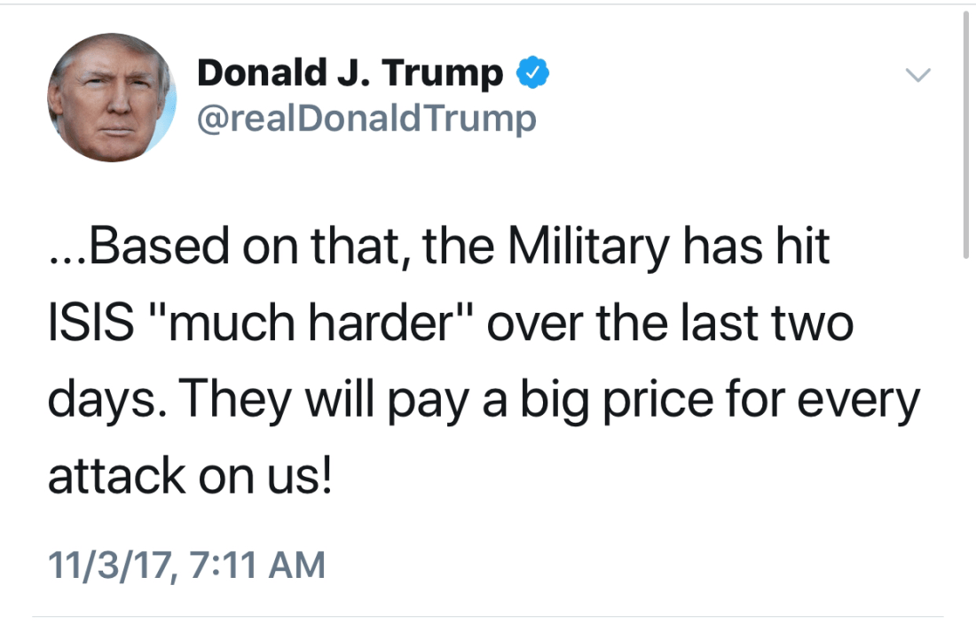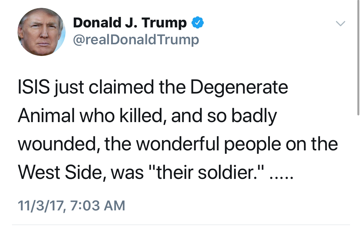 After calling the white man who shot over 500 people “sick,” he calls the man with more pigment who killed 8 and injured 12 a “degenerate animal.” (Hey NRA, what if instead of the rented Home Depot pickup truck the New York attacker had an Arsenal of your semi-automatic rifles? More carnage… ya think?)