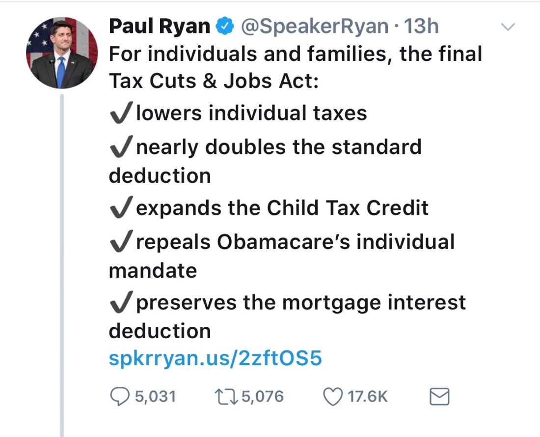 Now, on the eve of passing the GOP tax cut for billionaires and corporations, he and his co-conspirators are claiming it will pay for itself with economic growth, while Ryan simultaneously whispers in our ears that we will have to pay for these tax cuts, which will add $1.4 trillion to the deficit, by allowing him to cut “entitlements.”