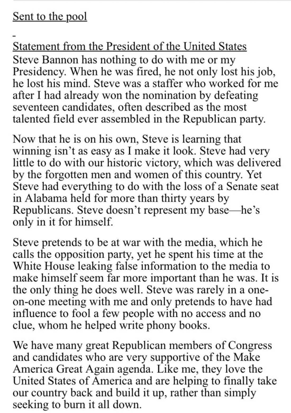 Trump’s personal response— “Steve Bannon has nothing to do with me or my Presidency. When he was fired, he not only lost his job, he lost his mind.”