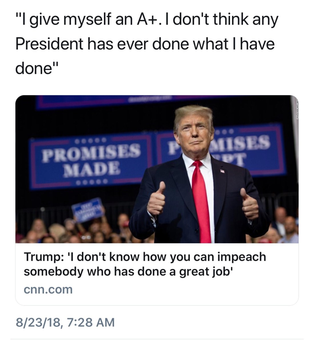 Shhh… Don’t tell him he has set up the economy to crash whether he stays or goes, giving his rich friends and big corporations a get out of taxes free card, eliminating consumer protections against predatory banking practices, making white collar fraud legal. A crash is inevitable. If he’s removed, we have a chance to minimize it. Don’t confuse him with facts. He cares about us.