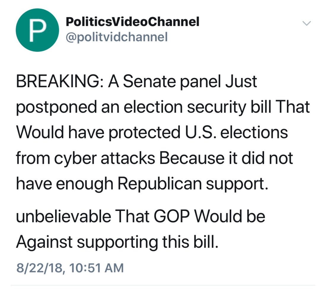 Yesterday: “U.S. SENATE MAJORITY LEADER MCCONNELL SAID CHANCES WERE SLIM FOR ANY CONGRESSIONAL ACTION IN SEPTEMBER THAT WOULD PUNISH RUSSIA IF IT INTERFERES AHEAD OF NOV. 6 ELECTION.” (Reuters)