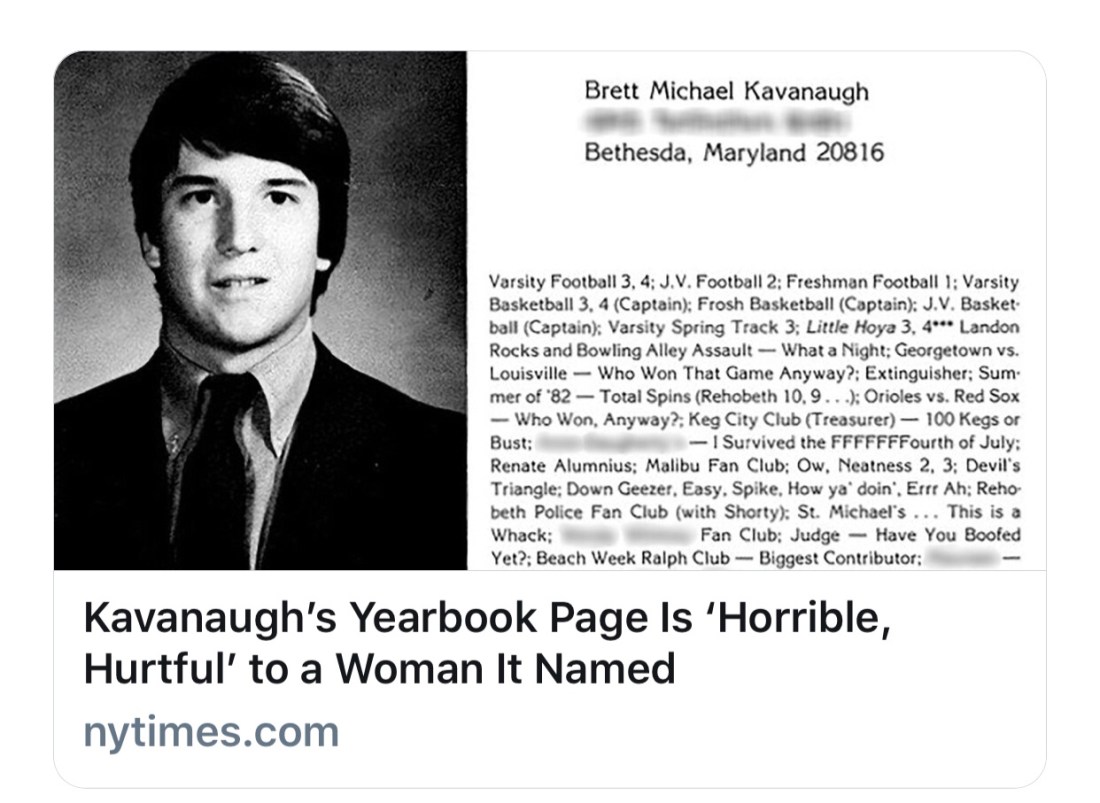 Kavanaugh’s senior yearbook names a woman repeatedly, implying something other than what he claims it meant. “A date.”
