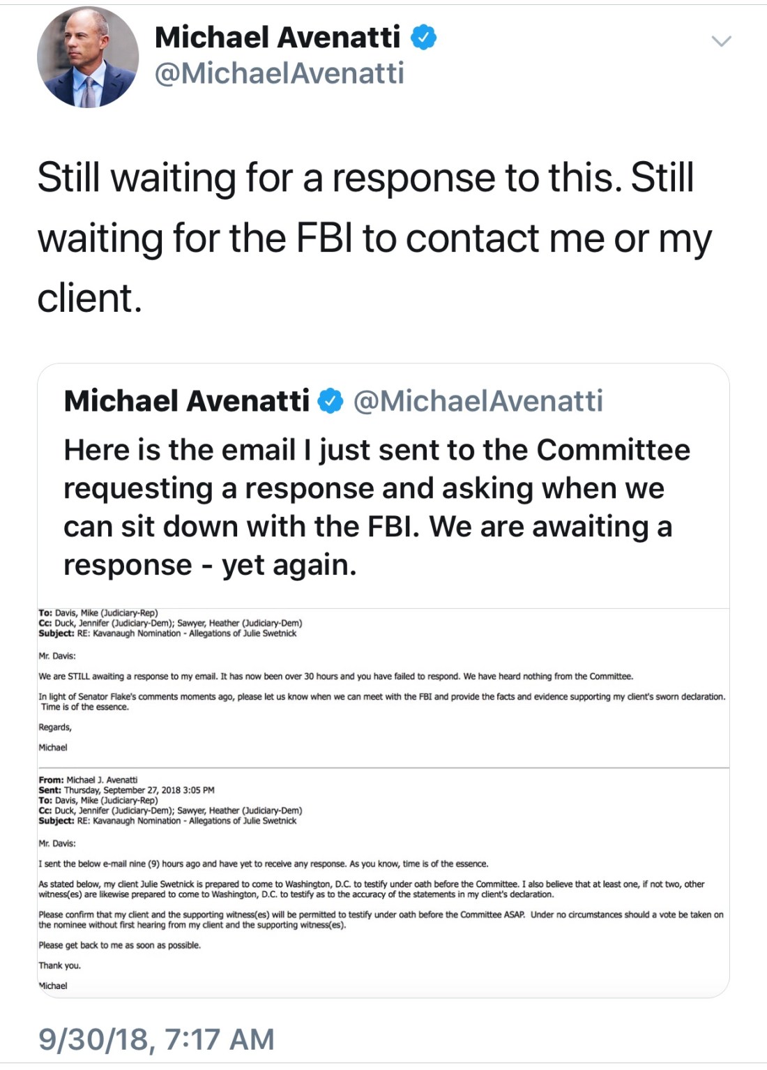Jeff Flake, possibly the easiest Senator to persuade, is receiving threats for his insistence on a week long delay in the SCOTUS vote, and an FBI investigation into nominee Brett Kavanaugh. Kavanaugh is hiding something.
