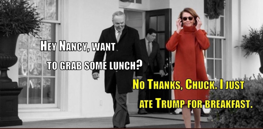 1. Don’t overplay this. It is clear that “I call her ‘Nancy” has both guts and brains…she made it so that he had serious skin in the reopening government game. But if the neo-cons (as in confidence tricksters, such as Coulter, Ingraham and “Judge” Janine, not conservatives) get too fired up he’ll continue to randomly, and egregiously, hurt regular people (like FBI agents, TSA, air traffic controllers, the Coast Guard and other “non-essential” government workers) in his attempts to go back to his favorite part of being president: “executive time” spent each morning, happily playing with the “mushroom man from Mario” in the glow of approval from Fox and Fiends (no I don’t mean “friends”).