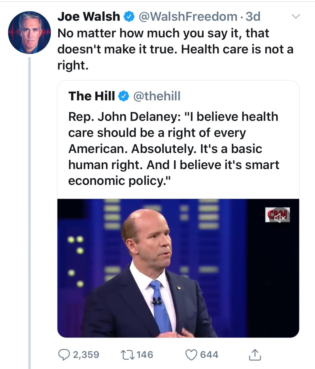 Wealth gap guy w/healthcare, Joe Walsh, doesn’t think healthcare is a right. The United States healthcare system ranks last on the list among developed nations for having accessible healthcare. We CAN afford to take care of our people, but the greedy super rich are not required to pay their fair share of taxes, as are the middle class, so there is no money for healthcare. That and the fact that too many people are making money off the backs of the sick.