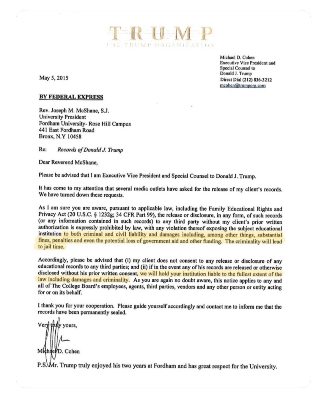 Further proof that Trump didn’t earn his entry to Wharton was provided by his former attorney, Michael Cohen, who admitted during testimony to having threatened Trump’s former schools with lawsuits should any of his transcripts be released to the media.