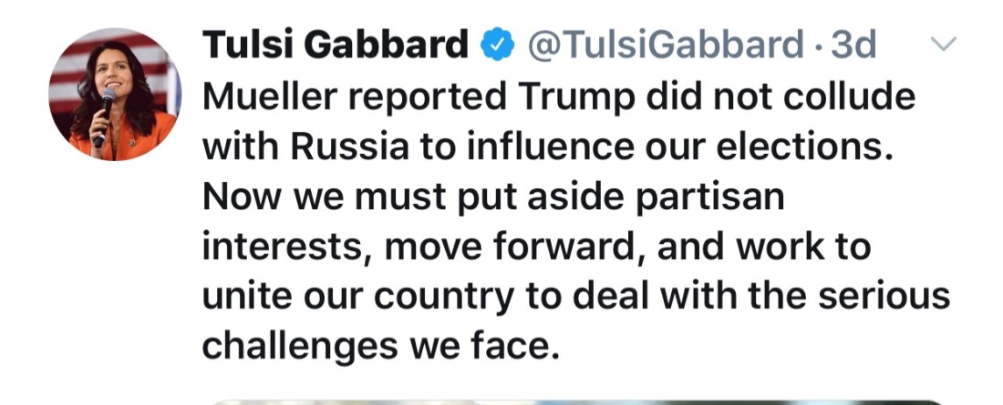In my opinion, Hawaii’s Tulsi Gabbard is a faux Democrat. She speaks fluent GOP. She’s an anti-democratic Democrat. Russia groomed? (I just edited this way down. Trying to be nicer.)