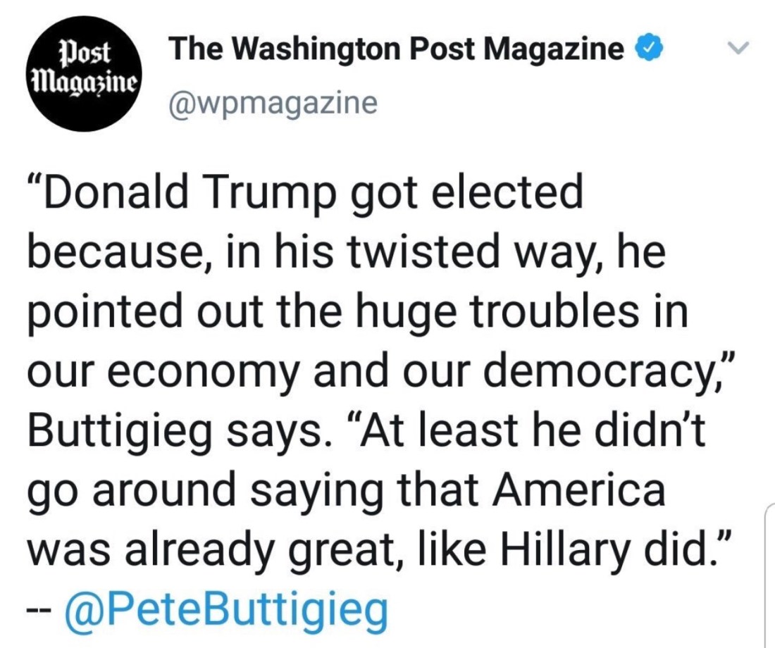 “Just to make this clear, I think America would be a much better place if she were President, that’s why I voted for her and that’s why I campaigned for her, and I have enormous respect for Secretary Clinton.” ~Peter Buttigieg