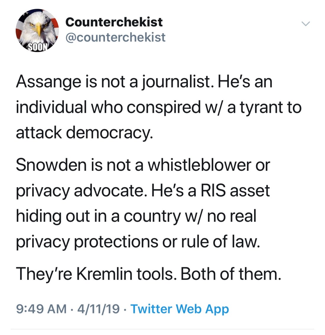 In response to an unposted comment- Assange is not a journalistic martyr, he worked for Russia, as did Roger Stone, Paul Manafort, Carter Page, Mike Flynn, and Trump. He published stolen information on behalf of Russia to manipulate our election. He was never a journalist. Espionage is not journalism.