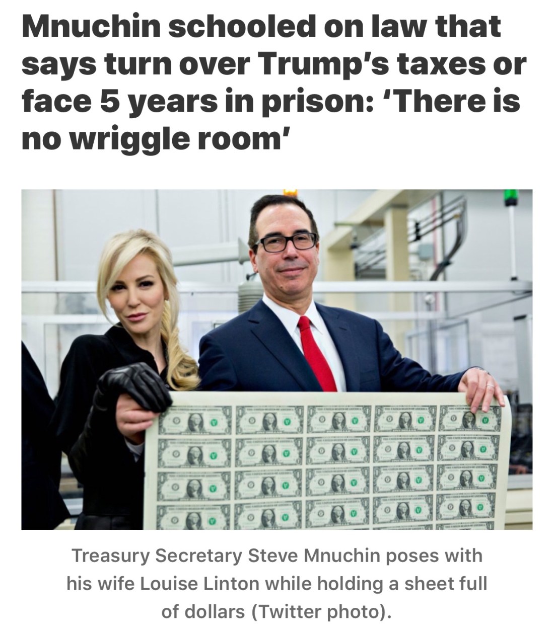 The second story is Steve Mnuchin ignoring a congressional request to turn over Trump’s taxes. A deadline set by congress came and went… ignored. The law is clear, it requires Mnuchin provide congress with Trump’s taxes on request. With his refusal to comply, Mnuchin risks a 5 year prison sentence. He does not appear to be worried.