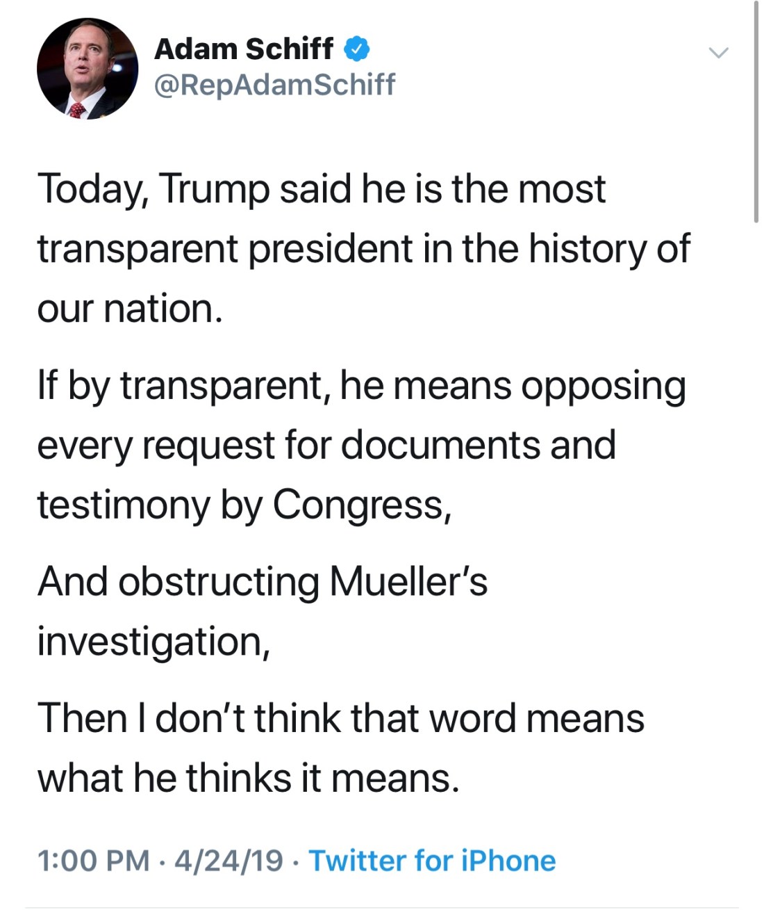 “I’ve been the most transparent president …most transparent administration in the history of our country.” ~Donald Trump, 4/24/2019