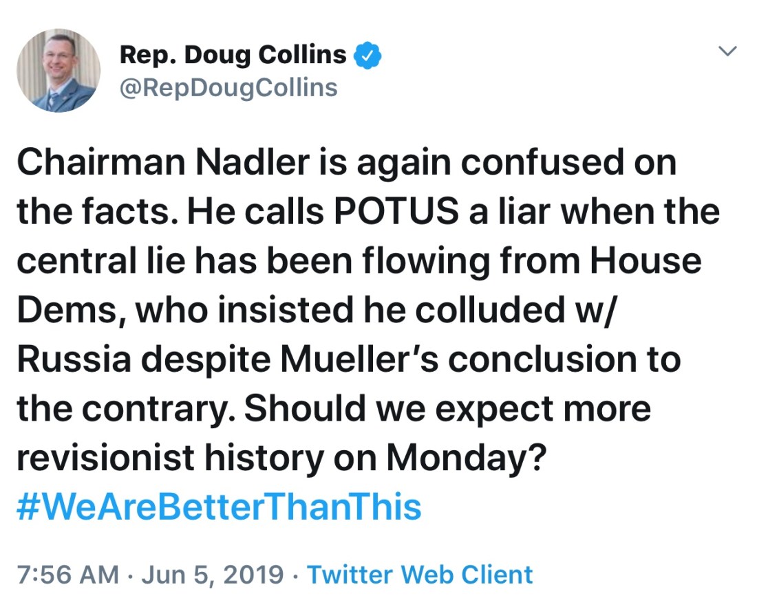Such an investigation was the two-year project of Special Counsel Robert Mueller; he found evidence which is being withheld from the House of Representatives by Attorney General Bill Barr and the White House. That investigation needs to be followed through, Rep Collins.