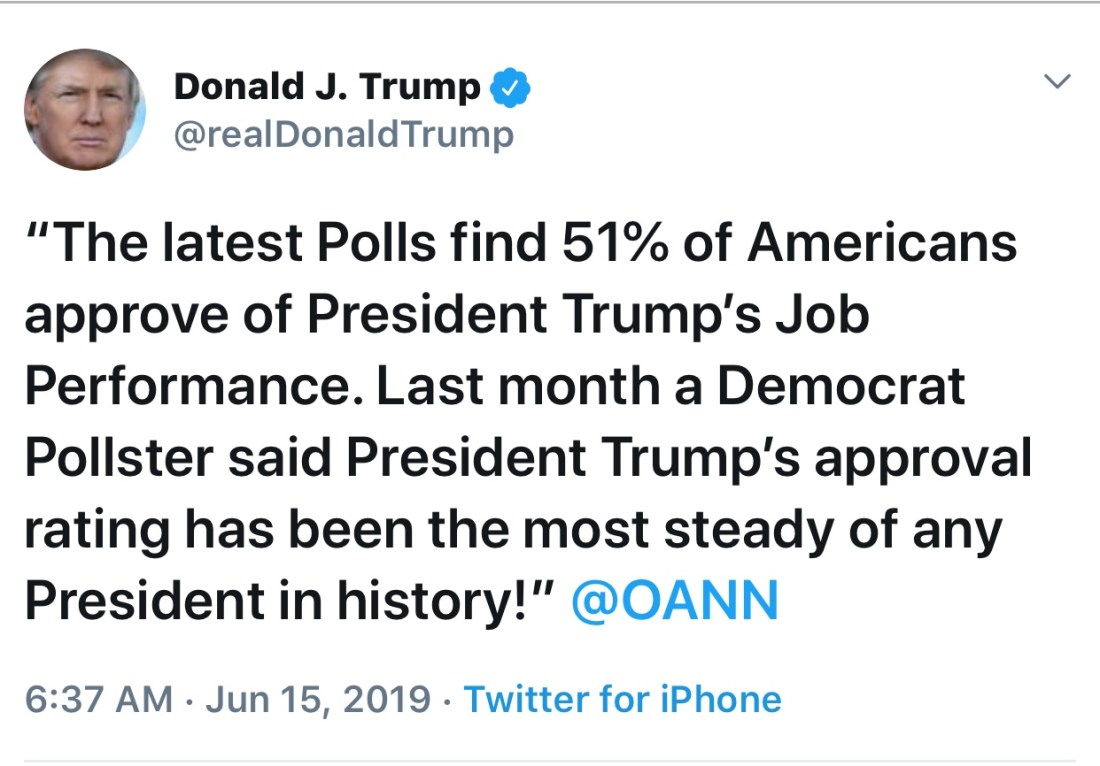 Trump has been tweeting results of a poll, posted by the right-wing propagandist network, which gives him a 51% approval rating. This lie and the repetition of it will serve to set us up for the next election. Trump will cheat and, when he wins despite widespread disapproval, he’ll deny interference citing the invented polls as proof that he had the support of a majority of voters.
