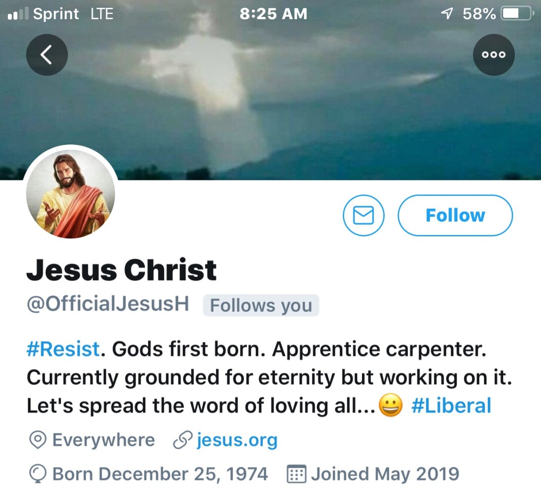 All at the same time this morning: clap of thunder, loudš„BANGš„ (not thunder)āpower goes out, and a twitter alert tells me @OfficialJesusH is following me. š¤ What does it mean? Iām here in the dark having an existential crisis. (Also, Iām older than Jesusš)