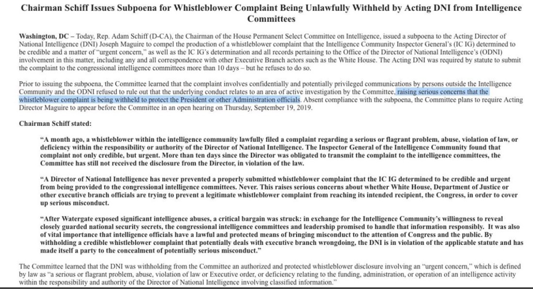 - There is a whistleblower among the intelligence community with compelling information about the toupeed tyrant. House Intel Committee Chaiman Adam Schiff, who announced this to the public in an effort to protect the whistleblower, says the Director of National Intelligence is withholding information that was deemed urgent. The inspector General agrees that this information is urgent, but Don the Con’s fixer, Attorney General Bill Barr continues to protect he who isn’t his client, from any adverse testimony, any investigations or inquiries, to the point of putting our national security at risk. Additionally, the Department of Justice, headed by Barr, continues to block the House Judiciary Committee from seeing Grand Jury material from the Mueller probe.