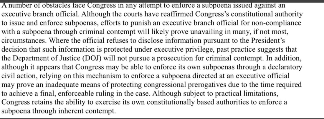 Congress has a card they haven’t played,👆🏼called “inherent contempt” which would hinder, if not eliminate the willingness of witnesses to undermine Congress on DT’s behalf. The clause empowers the House and the Senate to call for the arrest of individuals who act in contempt, without the requirement of involving the other branch of Congress, the executive branch, or the Courts.