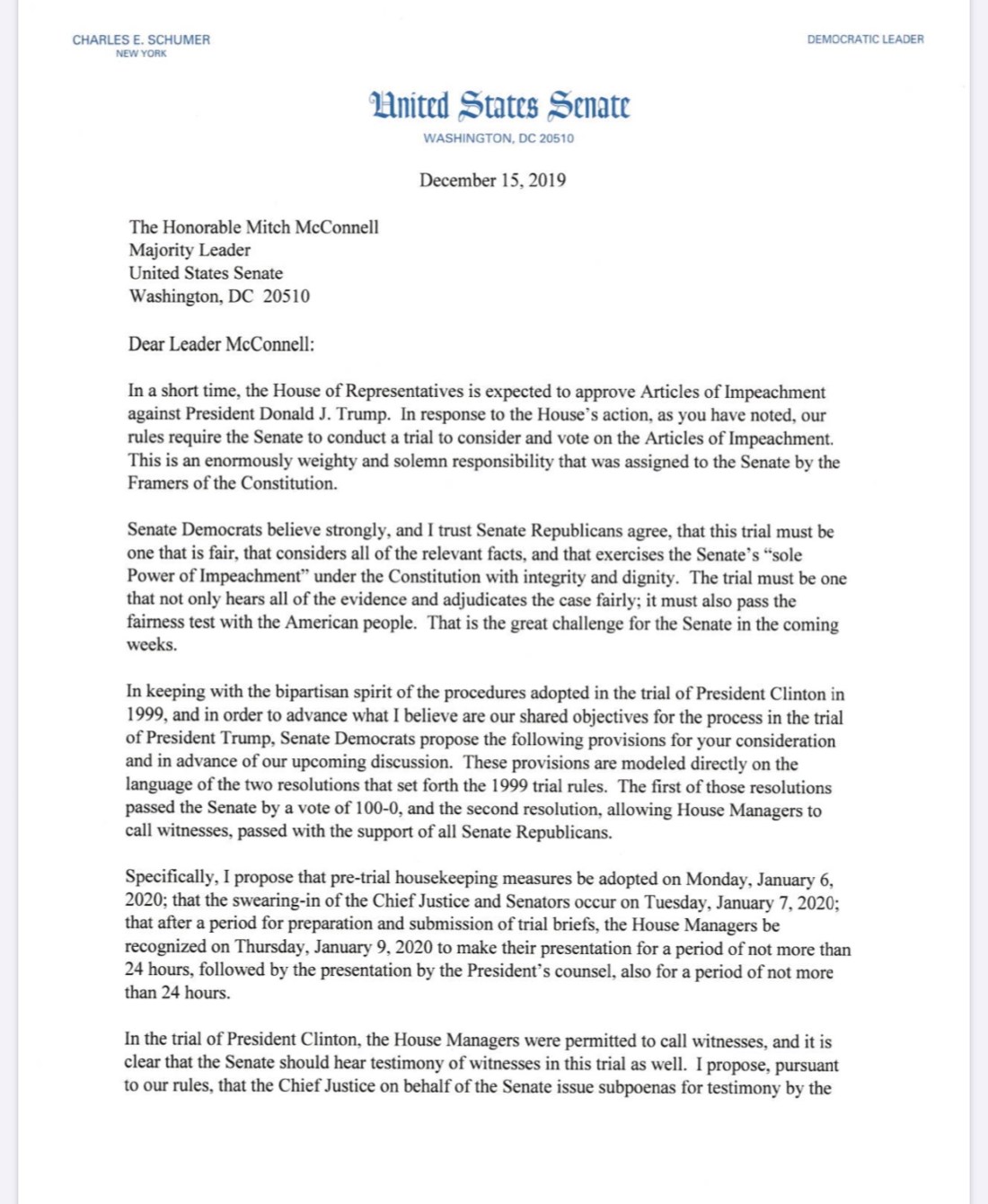 Schumer’s letter is an opening offer. He names four potential witnesses who he would like to testify. Can his letter change the course of events?