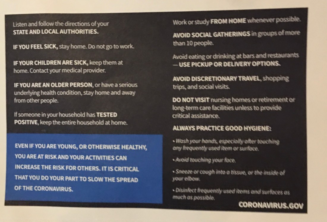 3. The postcard bugged me also. I think it is basically campaign related. $$ would have been better spent on ventilators. Just as wall money would have been better spent on CDC…which seems to be missing in action. My husband noted that on the front it said “President Trump’s Coronavirus”. Maybe we should start calling it that.