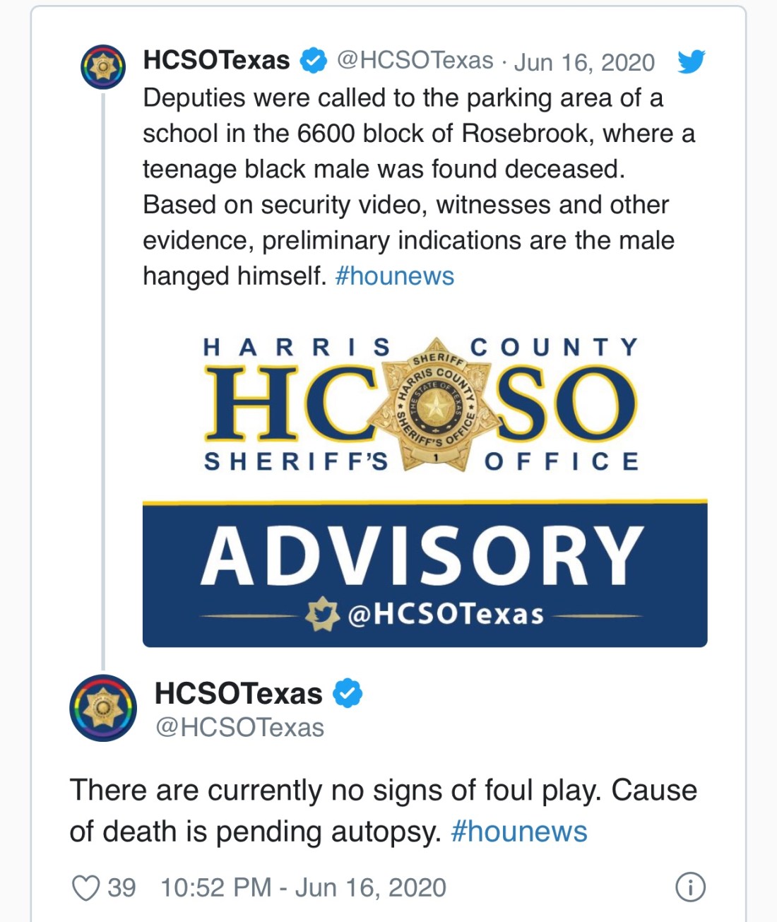 The following day, June 16th, a 17-year-old black male was found hanging from a tree on the property of an elementary school in Spring, Texas- near Houston.