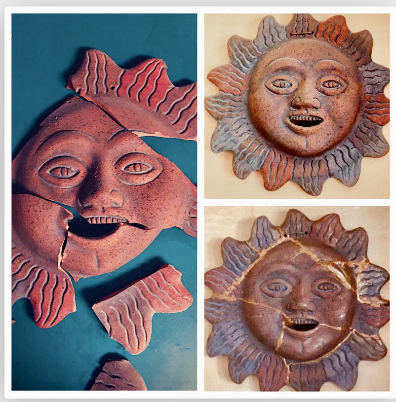 I bought this clay sun in Guadalajara 25 years ago. It hung by a leather string on my kitchen wall since the day I moved in. Not too long ago I heard a crash in the kitchen. The leather string had deteriorated and crumbled under the weight. I called my daughter who told me about a Japanese tradition of using gold to repair broken pottery. I googled it, and this is the sloppy mess I created. This sun is a metaphor for my life. It’s also how I see the US right now. We are broken. if we try really hard we can be repaired. We may end up a shittier version of what we once were, but it will be so much better than what we are today.