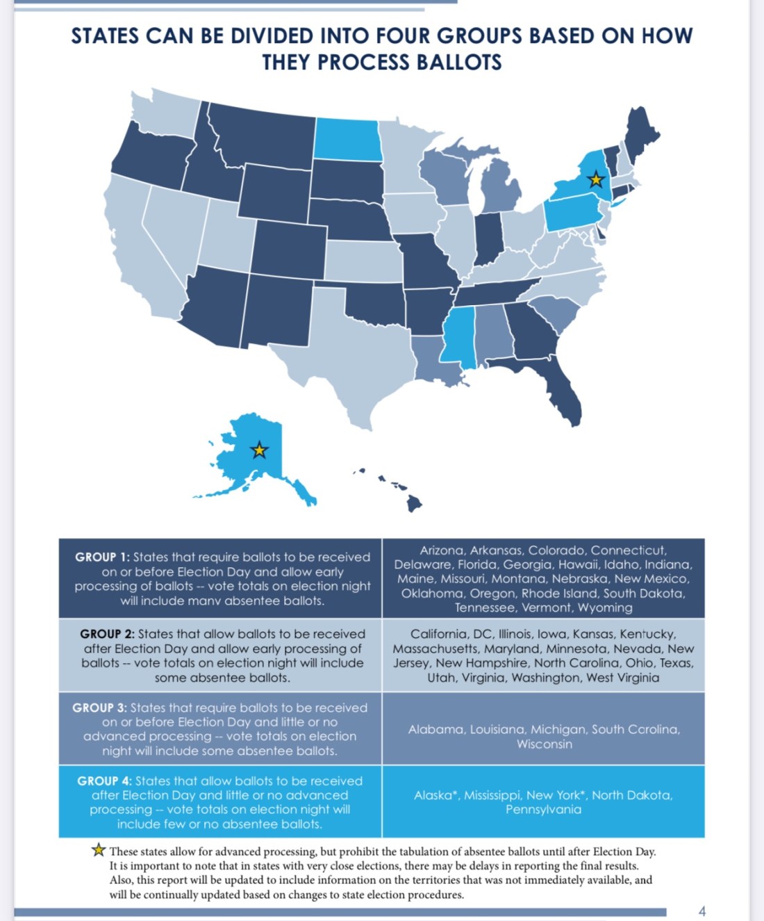 Each state is different in how they count ballots and when they stop accepting them. This information explains why some states take so much longer post results than others. This is good to know; information is power.