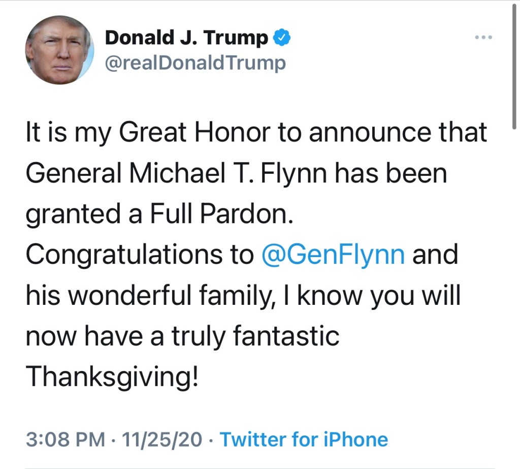 As anticipated, Trump has issued a pardon on behalf of his first National Security Advisor, General Mike Flynn. You may remember Flynn pleaded guilty to a felony count of willfully and knowingly making false statements to the FBI.