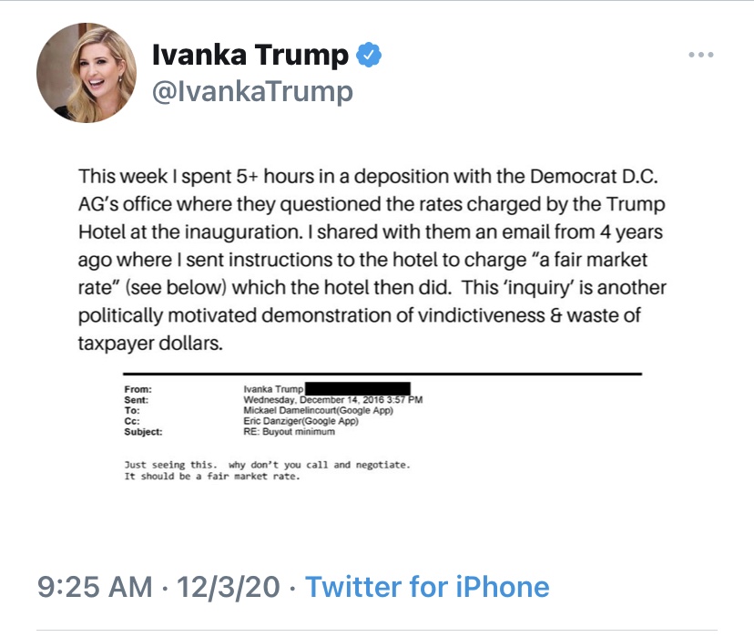 Ivanka was deposed for several hours last week, questioned about Trump Hotel price gouging and fleecing the RNC. She attempted to garner public support on Twitter, claiming that to question her theft was ridiculous.