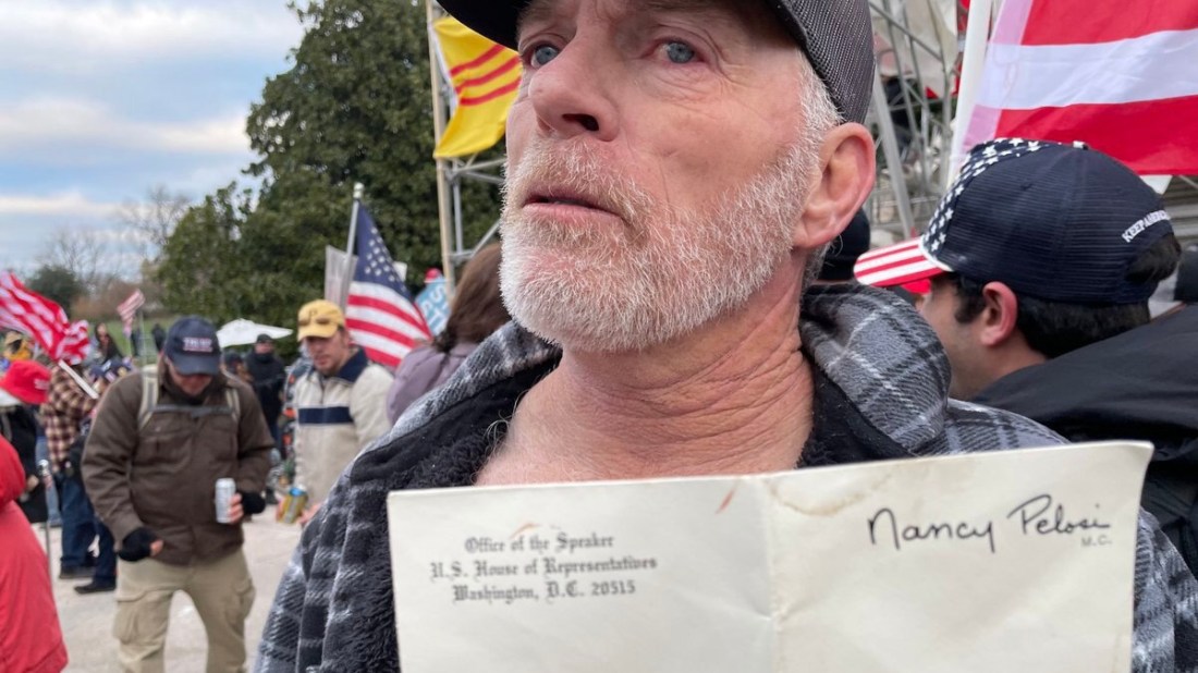 The same was reported about the man photographed with his feet on Nancy Pelosi’s desk, and again later outside holding her mail.