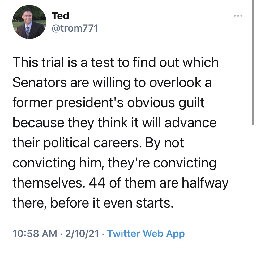 Several Republican Senators decided long ago not to convict Trump. These are the same Senators who played into Trump’s provocation of his base. Ted Cruz and Josh Hawley, in particular, spoke openly on the subject of election results, nurturing the lie that the election was stolen. Those senators childishly made a spectacle of their refusal to listen to evidence.