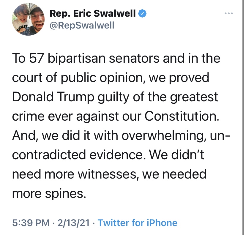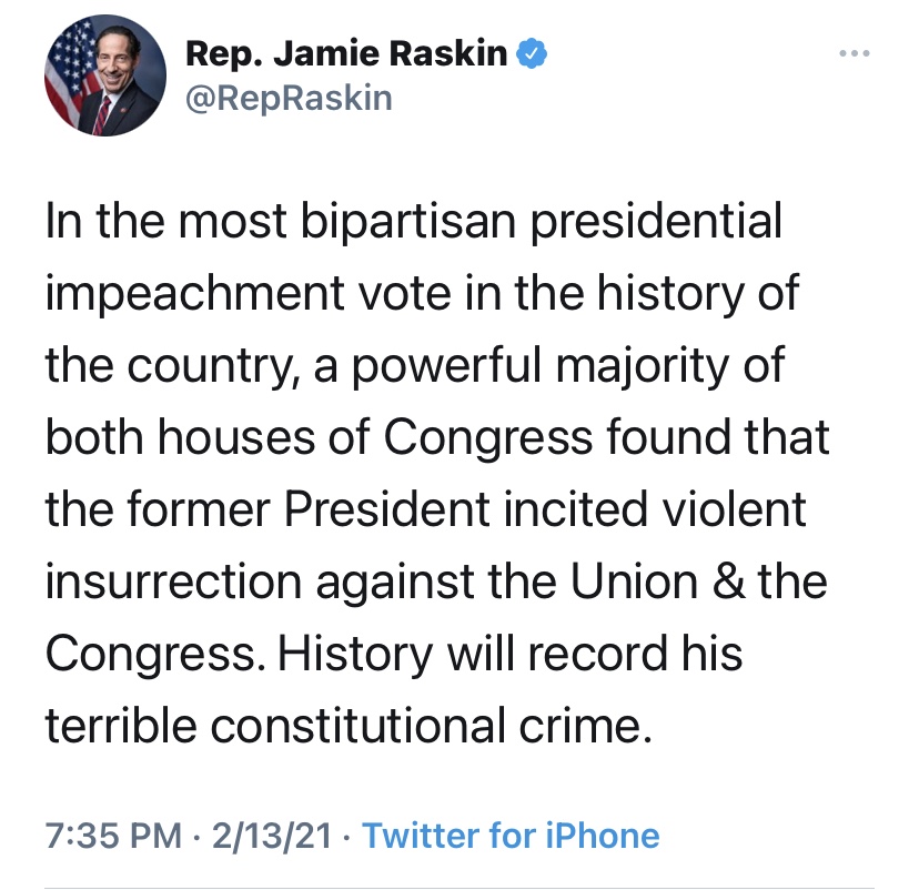 I love Jamie Raskin, but is the outcome of the impeachment trial less relevant than having Republicans on record, whitewashing the most impeachable conduct in US history? Because I am so in awe of Representative Raskin I have to whisper—I don’t think so.