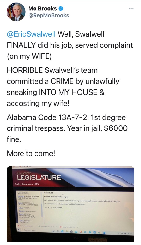 Mmm…no. His response to finally being served with the suit filed against him, by Representative Eric Swalwell, for his seditious role in the January 6 attack that resulted in five deaths, was to tweet an accusation that Swalwell broke into his home to collect evidence thereby accosting his wife. To validate his menacing tweet, the “Cyber Innovative Technologies” genius extraordinaire shared a picture he took, of his computer screen, showing the definition of Alabama’s code on “criminal trespass.”