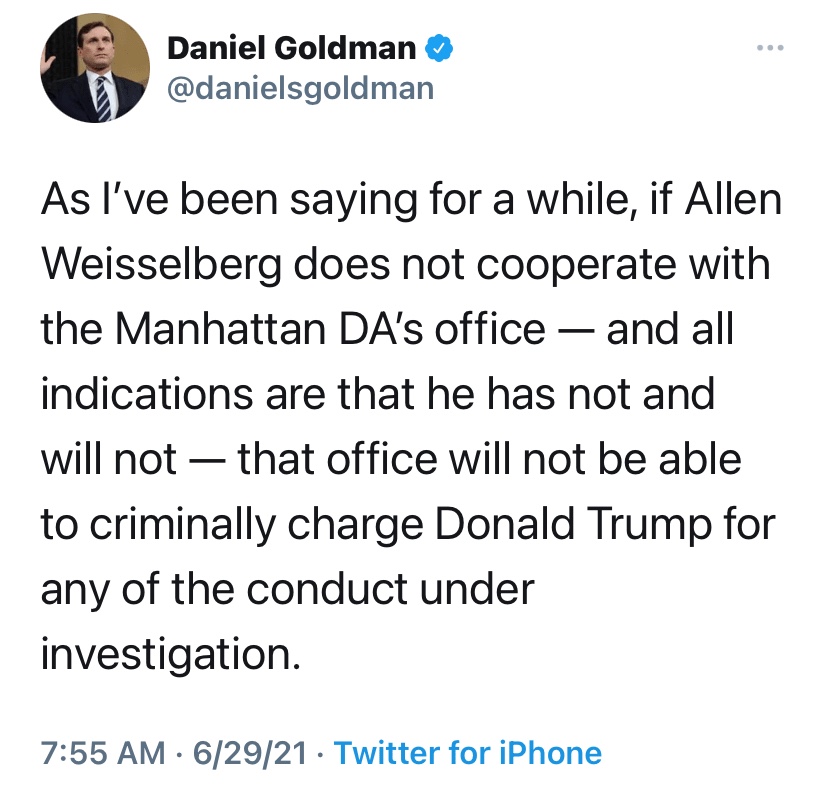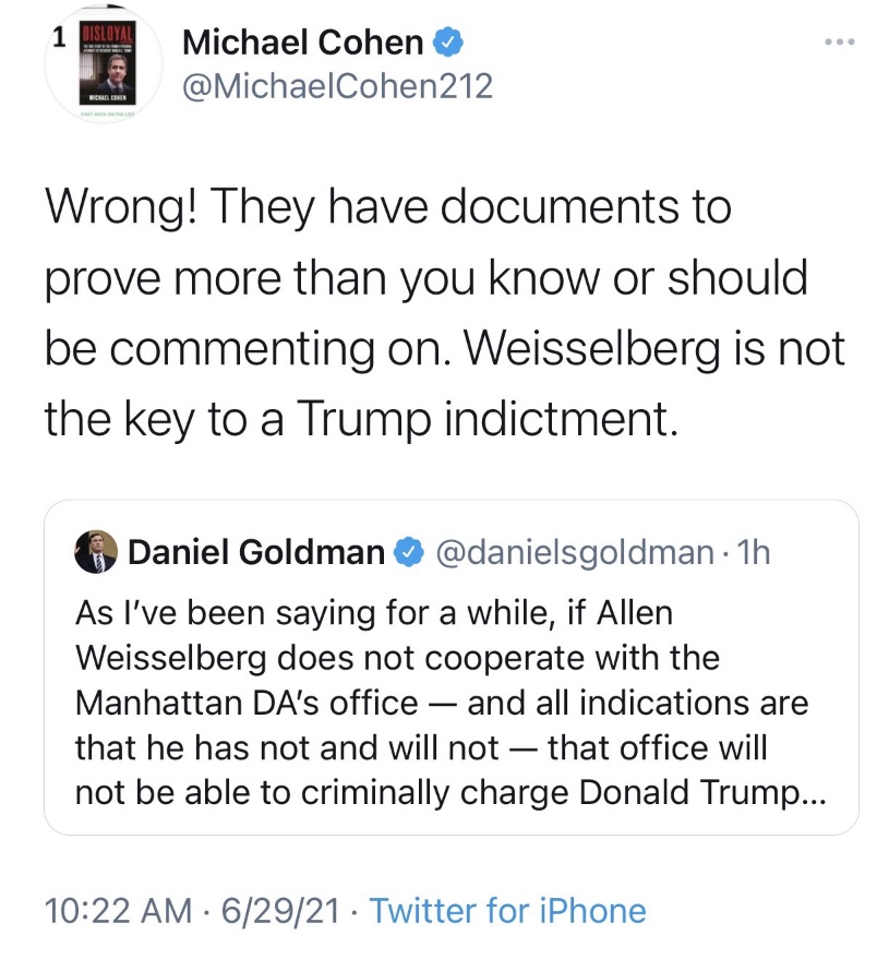 Trump’s former Attorney Michael Cohen, an insider for 10 years who has cooperated with the New York District Attorney claims to know the evidence they have on Trump, and disagrees with Goldman’s assessment that Weisselberg’s cooperation is imperative.