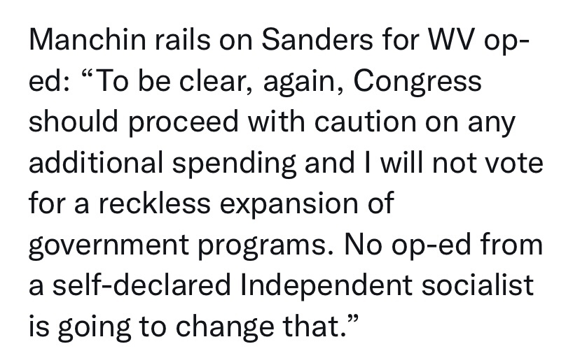 Today (Oct 24, 2021) an NYTimes letter to the editor writer suggested we start a Go Fund Me for Joe Manchin so his family can continue to enjoy the same income he now receives from his “investments” in coal stock etc. which could then incentivize him to support pending Democratic legislation that phases out coal et al in West Virginia.