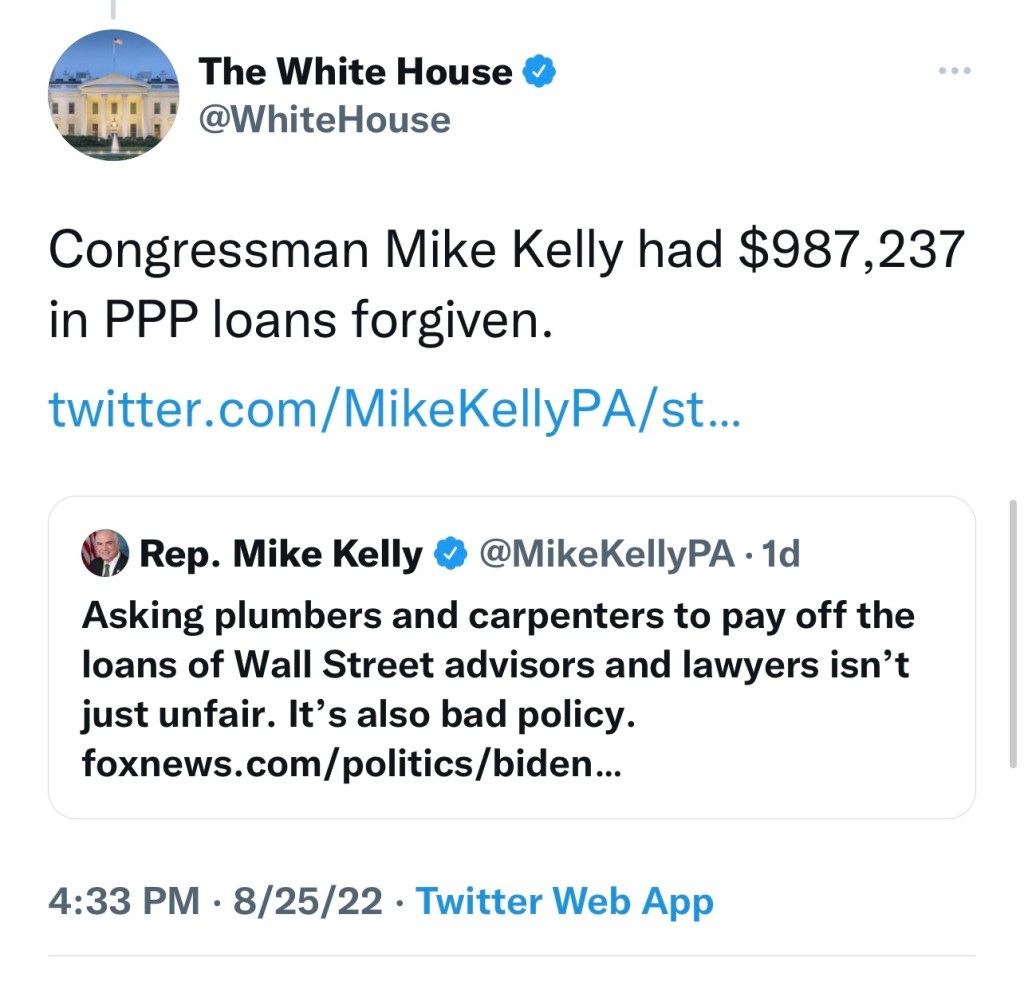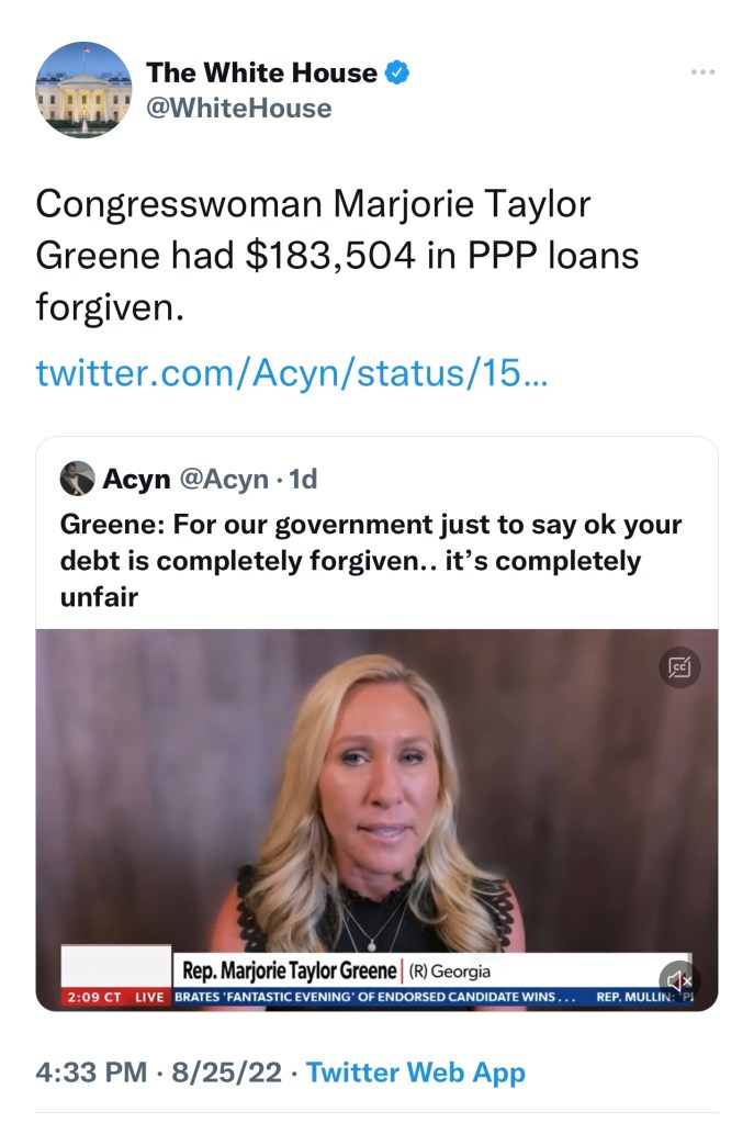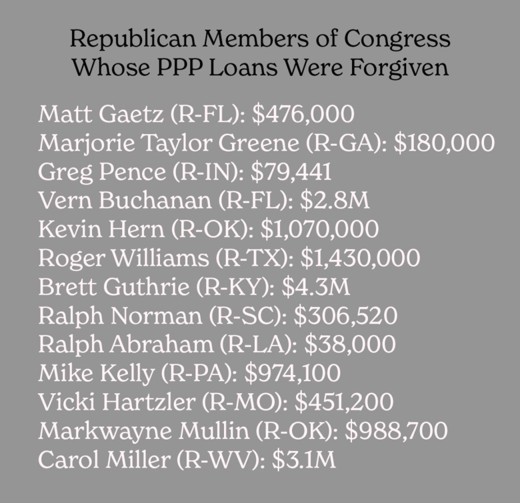They took money that was intended to keep people employed during the beginning of the Covid pandemic. The Payroll Protection Program was a grift devised by the former United States Secretary of the Treasury, Steve Mnuchin, and twice impeached, one term POTUS, Donald Trump. The money was disbursed over several weeks beginning April 3, 2020. Government has forgiven nearly $400 billion in Covid-relief PPP loans, according to federal watchdogs.