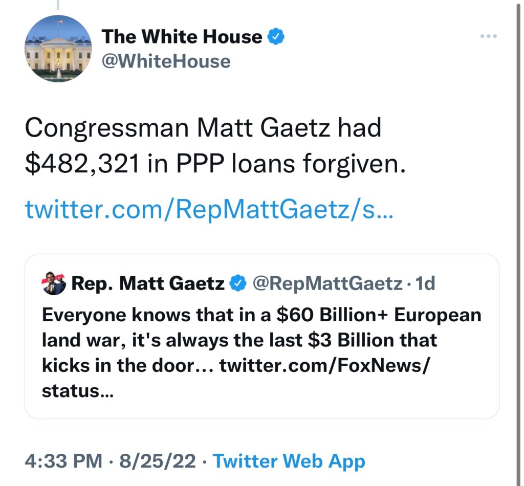 A few more, but still not all: Joel Osteen, televangelist pastor, collected $4.4 million in PPP loans. Osteen is most egregious because his church (like the rest,) pays $0 taxes. Would the following recipients surprise you? Jared Kushner, Devin Nunes, Kanye West, Tom Brady and the wife of Moscow Mitch, (then transportation secretary) Elaine Chao received $334,000.