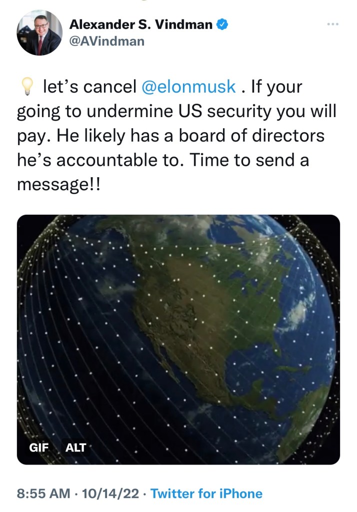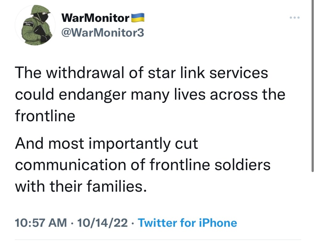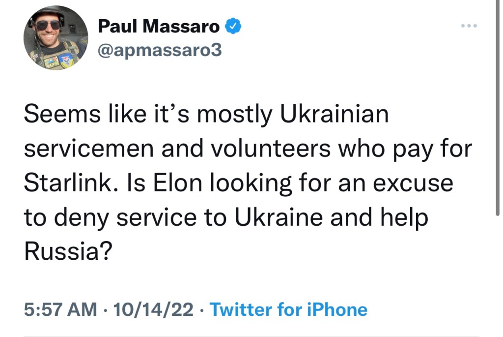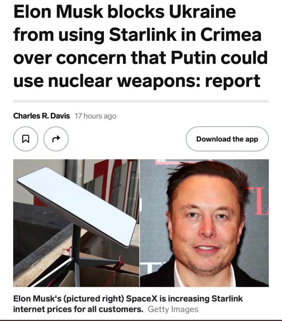 I’m going to go out on a limb and say Putin outbid the U.S. and Ukraine for Musk’s solidarity. Did Putin pay Musk to tweet, “surrender Ukraine,” and to cut Wi-Fi service? I think so.