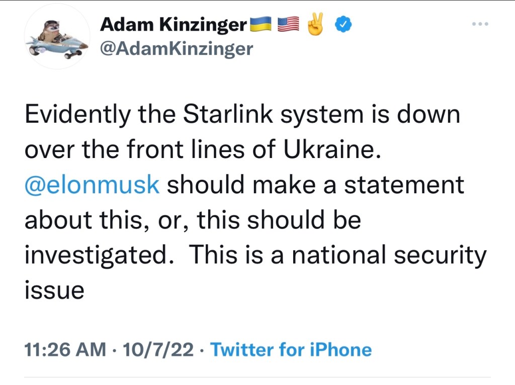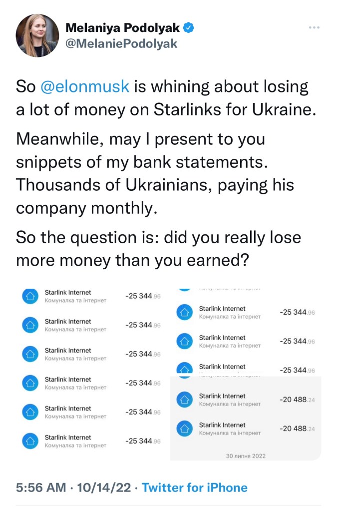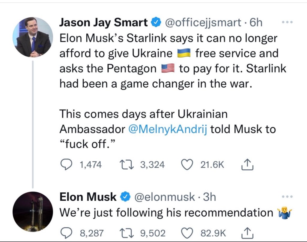 Elon Musk has been insulted. After suggesting Ukraine just surrender to Russia, then being told to “fuck off,” (rightly so,) by Melnyk Andrij, Ukrainian Ambassador, Billionaire Musk claims he can no longer afford to provide his “free service” to Ukraine.