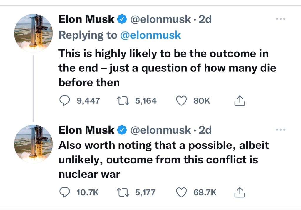 Last week Musk echoed Putin’s threats of nuclear war and that “Ukraine belonged to Russia.