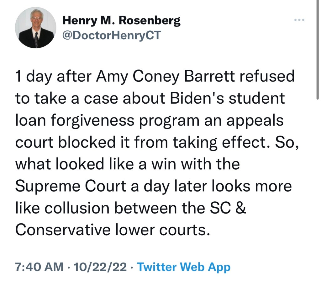 Two republicans filed an injunction to stop the process. In a game of look how I’m not what I’ve been accused of, SCOTUS Amy Coney Barrett voted against those republicans. (Odd) Those republicans have taken their complaint to the federal appeals court who responded on the side of republicans and froze loan forgiveness. This was the plan when Barrett voted no. It was mental manipulation, an attempt to make the SCOTUS look less partisan.
