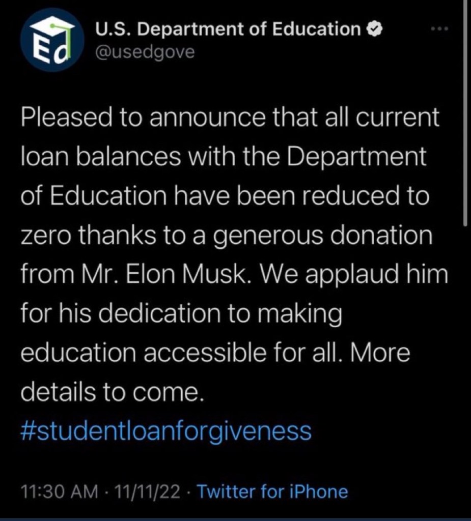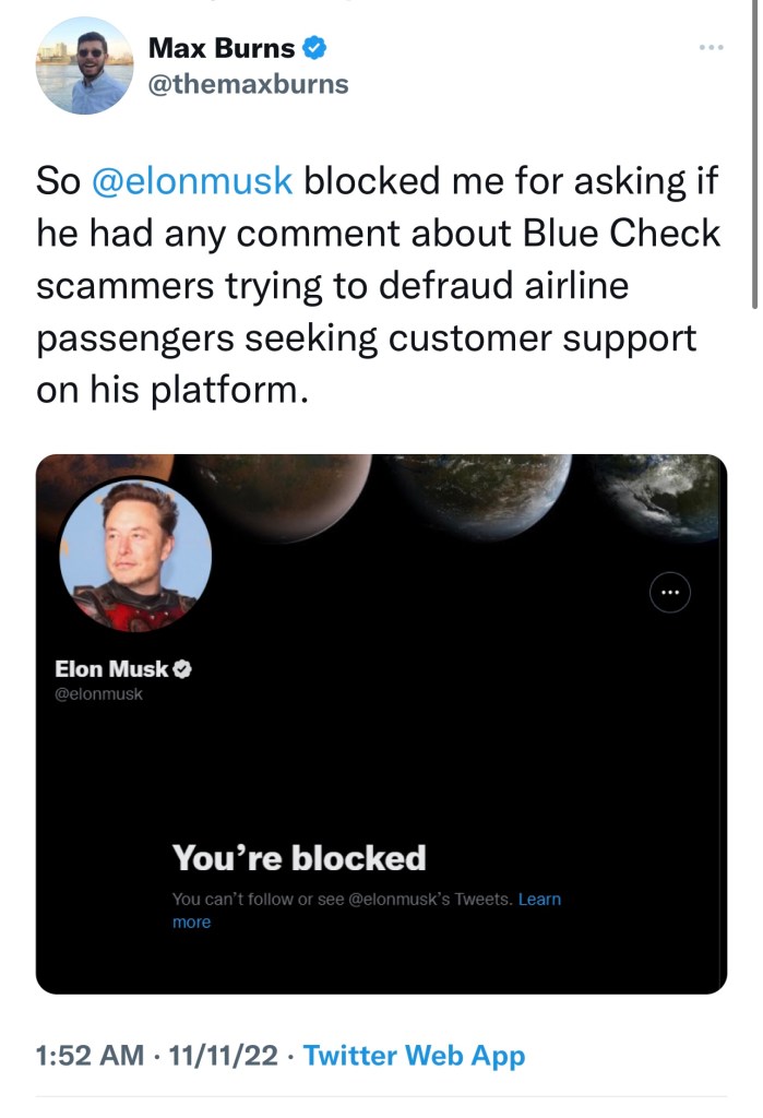 He determined that by charging the big shot blue check-mark people a monthly fee of $8, he’d recoup a couple of dollars. They all said they wouldn’t pay, they’d leave Twitter before they paid him a dime. So, the CEO of Tesla sold blue check-marks to anyone who had $8. This is how it went.