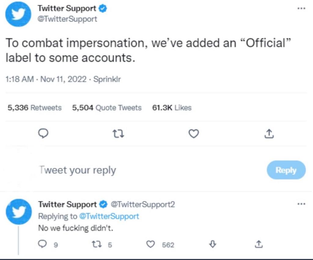 The above tweet was created by a random person who paid $8 for a blue verification and did a great impersonation of the company’s account, as you can see from the response Tweet below. Two hours later: 👇🏼👇🏼👇🏼.