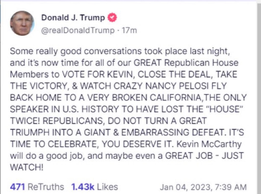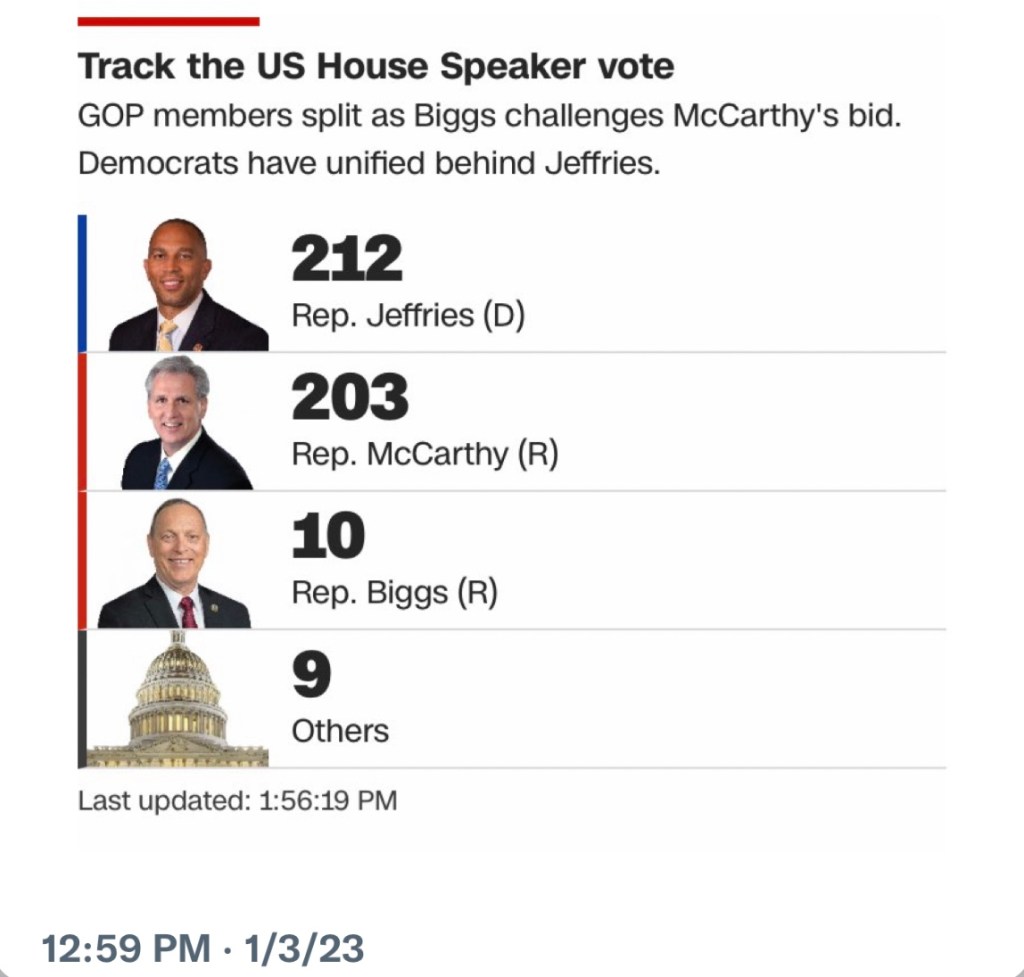 Trump has given his endorsement, so my bet is that the next vote will present McCarthy with the 218 votes he needs to achieve his life goal of becoming Speaker of the House.