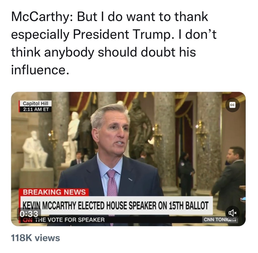 After the last count early this morning, he thanked Donald Trump. Why? Trump endorsed McCarthy somewhere between the 3rd and 10th tally, but it didn’t help.